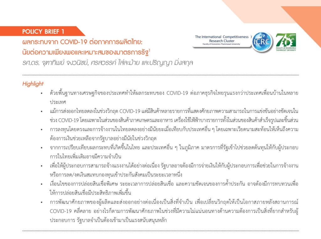 ผลกระทบจาก COVID-19 ต่อภาคการผลิตไทย: นัยต่อความเพียงพอและเหมาะสมของมาตรการรัฐ